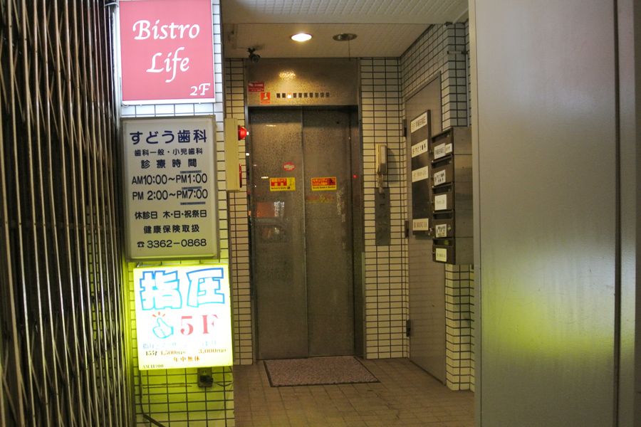 店舗ビル入り口。5階へどうぞ